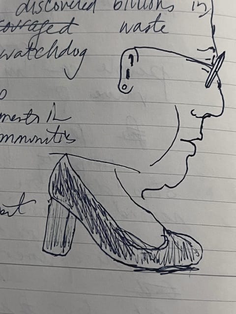 You'd think that would create a lot of pressure on the nine Democrats in the race to start grappling with reality, dropping out if their chances are too low. So far that hasn't happened, but this weekend is the California State Democratic Party convention in San Francisco. It's possible that, after a delegate vote and a hard look at their campaign funds, a few candidates will start to draw that conclusion. Until then, I thought I'd give my impression of the candidates, based on a marathon forum conducted by Nancy Tung and the SF Dems that I attended to today. I've also included a few sketches I did, and no, I don't have a shoe fetish. I just think they are easier to draw.