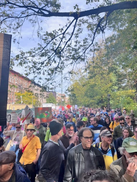 On Saturday, we walked through Prospect Park and people-watched before heading to Grand Army Plaza to march in the No Kings event there. It was sort of funny: there were a lot of people milling around in the farmers' market - some with signs, some with reusable bags - before it became clear where the march started. It was along Prospect Park West. It was very pleasant. We seemed to be in a quiet section where no one was willing to lead the "Hey hey, ho ho, Donald Trump has got to go" chant, so we shuffled along amiably, reading the signs, appreciating people's costumes. It was more low-key than an Oakland march, but it had the same oversampling of older white people and young parents that we get in the Bay.