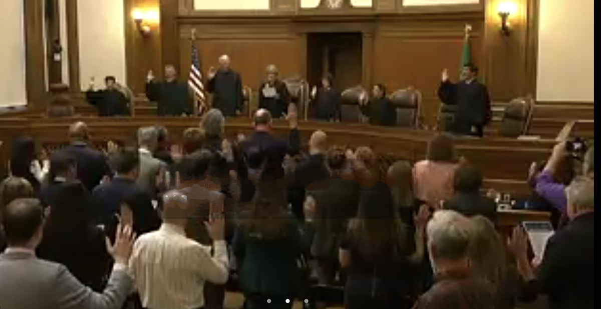I snuck out of my conference today to (re)take an oath to uphold the Constitution at the Kings County courthouse today in honor of National Law Day of Action. It was very moving to be among a huge group of other lawyers swearing to uphold the rule of law. I linked to a story about it below and I'm sure there will be more news tomorrow.