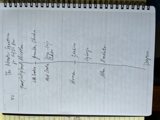Since I won’t say more about Dederer’s monsters, I thought I’d share an idea I came up with the other day: The Monster Spectrum. It’s possible this already exists, by the way. It’s a categorization of movie/TV monsters by size. At the small end of the scale are microbes/yeast/viruses. Next, we have little creatures, like Gremlins and Chuckie. Then we have medium-sized creatures, like dogs (Cujo) and sharks (Jaws). Then there’s a wide swath of human monsters, some of which are the embodiment of a smaller monster (like a zombie that is the host of a virus) and some are just awful people, like serial killers. The next category is cyborgs, followed by robots. Next up: aliens, obviously. Think Predator and the mother from Alien. Finally, you have your large creatures, usually dragons, but also dinosaurs. Here’s a picture of the spectrum that I drew while I was thinking about it.